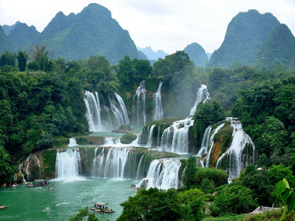 中國與越南邊境處的歸春河上游,瀑布?xì)鈩莅蹴?、蔚為壯觀,與緊鄰的越南板約瀑布相連,是亞洲第一、世界第四大跨國瀑布,年均水流量約為貴州黃果樹瀑布的三倍,為中國國家AAAA級旅游景區(qū)。還是“酒是故鄉(xiāng)醇”和“花千骨”的外景拍攝地,神奇而美妙。