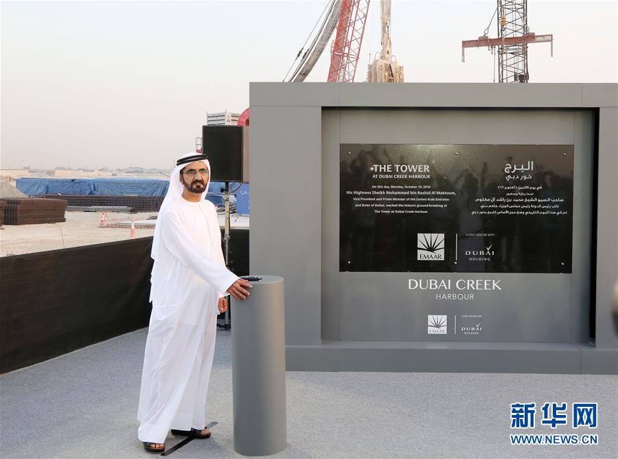10月10日,在阿聯(lián)酋迪拜,阿聯(lián)酋副總統(tǒng)兼總理、迪拜酋長穆罕默德·本·拉希德·阿勒馬克圖姆為未來“世界最高塔”啟動奠基儀式。