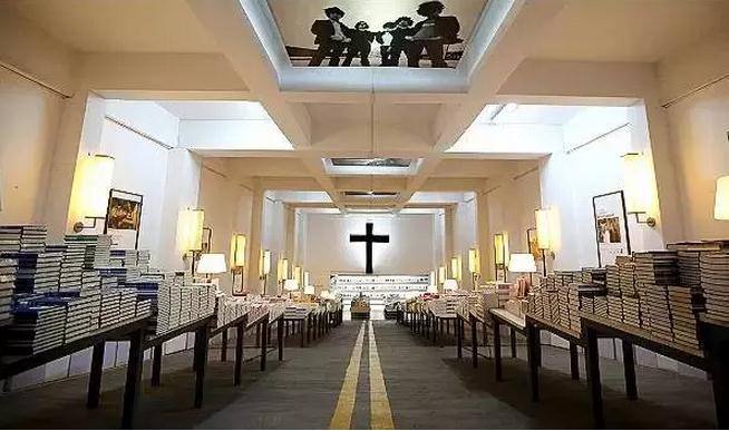 是的,這座書店位于地下車庫(kù),沒有過多的裝飾,所有的氣質(zhì),都是靠一本本精心挑選的書壘起來的。這里是一個(gè)叫人能沉下心閱讀的好地方,有一條很有名的走廊,走廊盡頭是一個(gè)十字架。閱讀會(huì)引領(lǐng)你到達(dá)靈魂盡頭,也許就是這個(gè)意思吧。