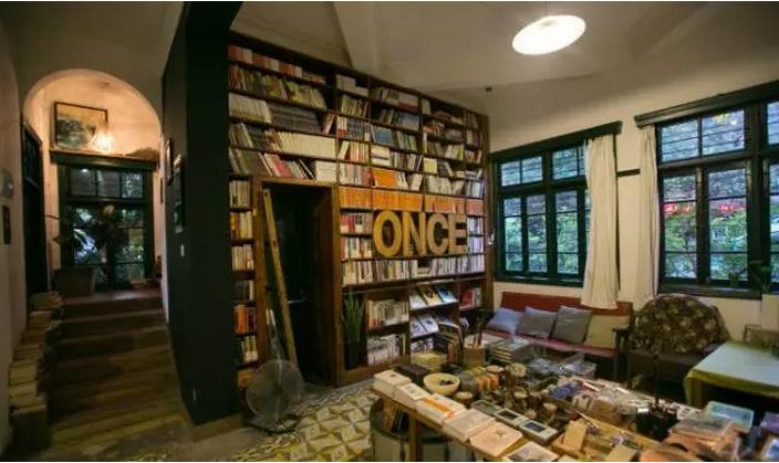 不在書店絕對(duì)是小清新中的小清新。它位于一座花園別墅中,整體裝修風(fēng)格也非常淡雅。草綠色的墻面配上翠綠色的窗框,有一種特別自然的感覺。白紗窗簾隨風(fēng)起舞,影子映在原木色的桌椅上,讓人不由地想起高中時(shí)的教室。書店里還有一面塞滿了書的書架,中間擺著ONCE英文字母。