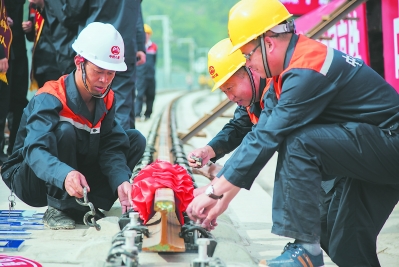 16日,工人對(duì)滬昆高鐵全線最后一段軌道進(jìn)行施工