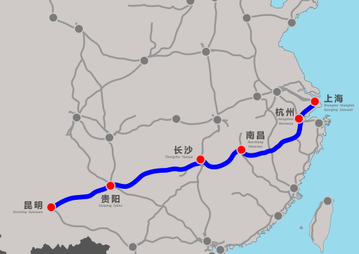 滬昆高鐵是我國(guó)《中長(zhǎng)期鐵路網(wǎng)規(guī)劃》中規(guī)劃的快速客運(yùn)通道之一,由滬杭客運(yùn)專(zhuān)線、杭長(zhǎng)客運(yùn)專(zhuān)線以及長(zhǎng)昆客運(yùn)專(zhuān)線組成,途經(jīng)上海、杭州、南昌、長(zhǎng)沙、貴陽(yáng)、昆明6座省會(huì)城市及直轄市,線路全長(zhǎng)2266公里,設(shè)計(jì)時(shí)速350公里,是中國(guó)東西向線路里程最長(zhǎng)、經(jīng)過(guò)省份最多的高速鐵路。通車(chē)運(yùn)營(yíng)后,從上海到昆明將由原來(lái)的20多個(gè)小時(shí)縮短到8小時(shí)左右。