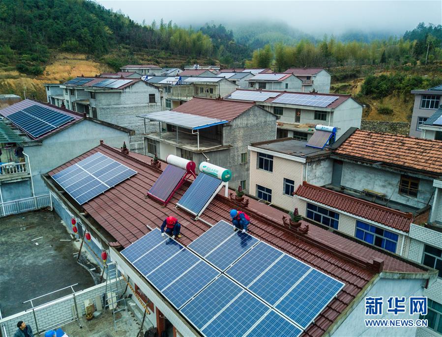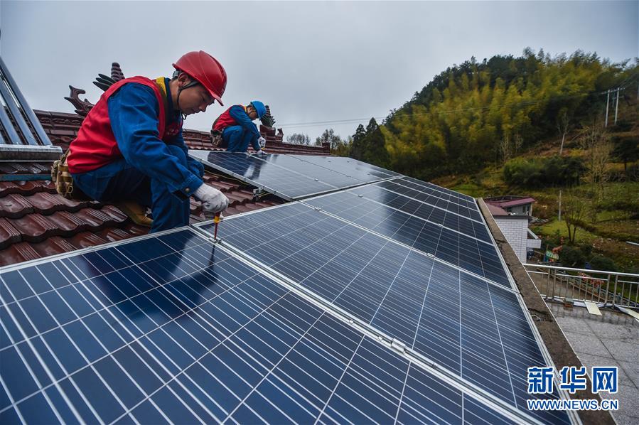 3月31日,工作人員在磐安縣盤峰鄉(xiāng)大嶺頭村的一戶居民樓頂檢查剛剛并網(wǎng)的光伏發(fā)電裝置。大嶺頭村目前已并網(wǎng)的個(gè)人光伏用戶有50多戶,占全村總戶數(shù)的70%,并網(wǎng)容量193.21千瓦,是當(dāng)?shù)赜忻男履茉础肮夥濉?。?016年開始,在各項(xiàng)鼓勵(lì)政策的推進(jìn)下,地處浙江省中部山區(qū)的磐安縣進(jìn)入個(gè)人光伏用戶快速增長期,2016年全年新增個(gè)人光伏用戶743戶,并網(wǎng)容量3272.335千瓦。截至2017年3月底,磐安縣已并網(wǎng)個(gè)人光伏用戶約900戶,并網(wǎng)總?cè)萘考s3900千瓦。新華社記者 徐昱 攝