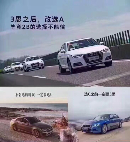 面對(duì)“挑事兒”的奔馳,寶馬、奧迪豈能坐視不理。先看寶馬在朋友圈的回應(yīng),“選C之前一定要3思”的文案寫在寶馬3系的背景圖上,強(qiáng)烈質(zhì)疑,火力全開。