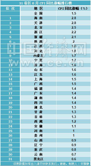 31省區(qū)6月CPI同比漲幅排行榜。制表人:宋雅靜
