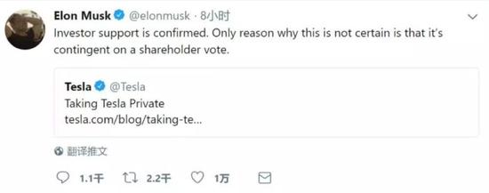 此外還需要強調的是,在任何人決定私有化之前,都會要求提供完整細節(jié),也包括提議的性質和資金來源。然而,現(xiàn)在這么做還為時尚早。我繼續(xù)和沙特基金溝通,也同時在和其他多位投資者進行討論,我一直計劃這樣做,因為我希望特斯拉仍然可以繼續(xù)擁有廣泛的投資者基礎。在向獨立董事會成員提出詳細方案之前,最好先完成這些討論。