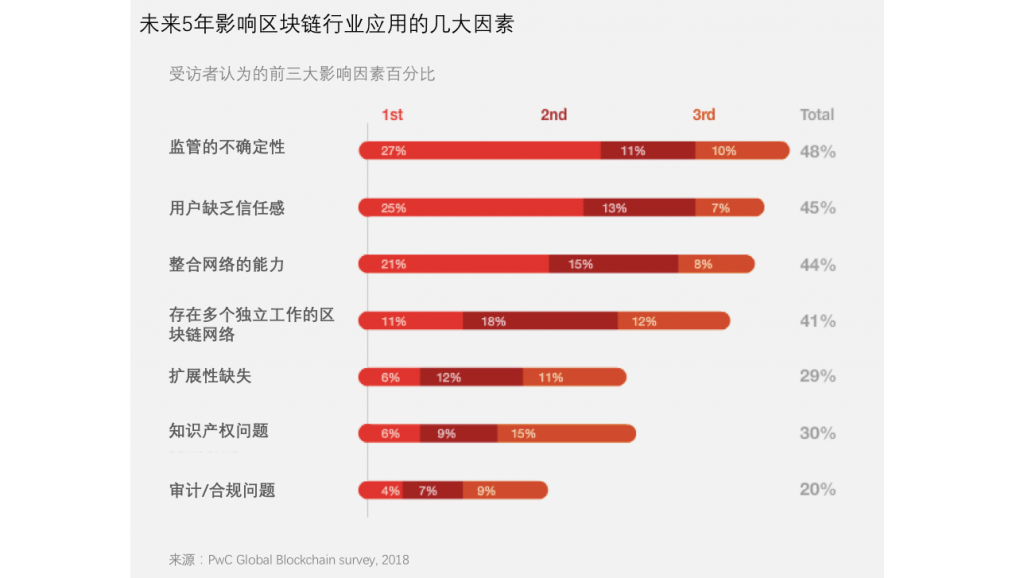 受訪者提到,未來區(qū)塊鏈在實現(xiàn)落地應(yīng)用的過程中面臨的主要障礙包括監(jiān)管方面的不確定性、“整合網(wǎng)絡(luò)的能力”、合規(guī)性以及知識產(chǎn)權(quán)方面問題。