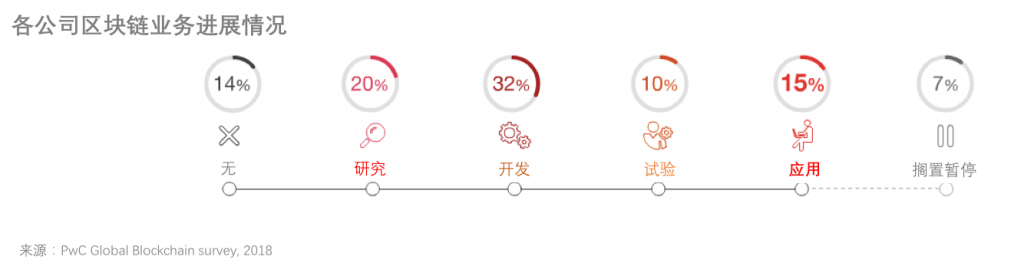 此外,報告還顯示,四分之一的高管表示其所在公司正在進行(10%)或者已經(jīng)完成了(15%)關(guān)于區(qū)塊鏈的試點試驗。近三分之一(32%)的高管表示其正在進行區(qū)塊鏈項目開發(fā),五分之一(20%)稱正在進行區(qū)塊鏈模式研究。