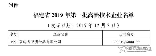 福建省亞明食品有限公司榮獲“國家級高新技術(shù)企業(yè)”