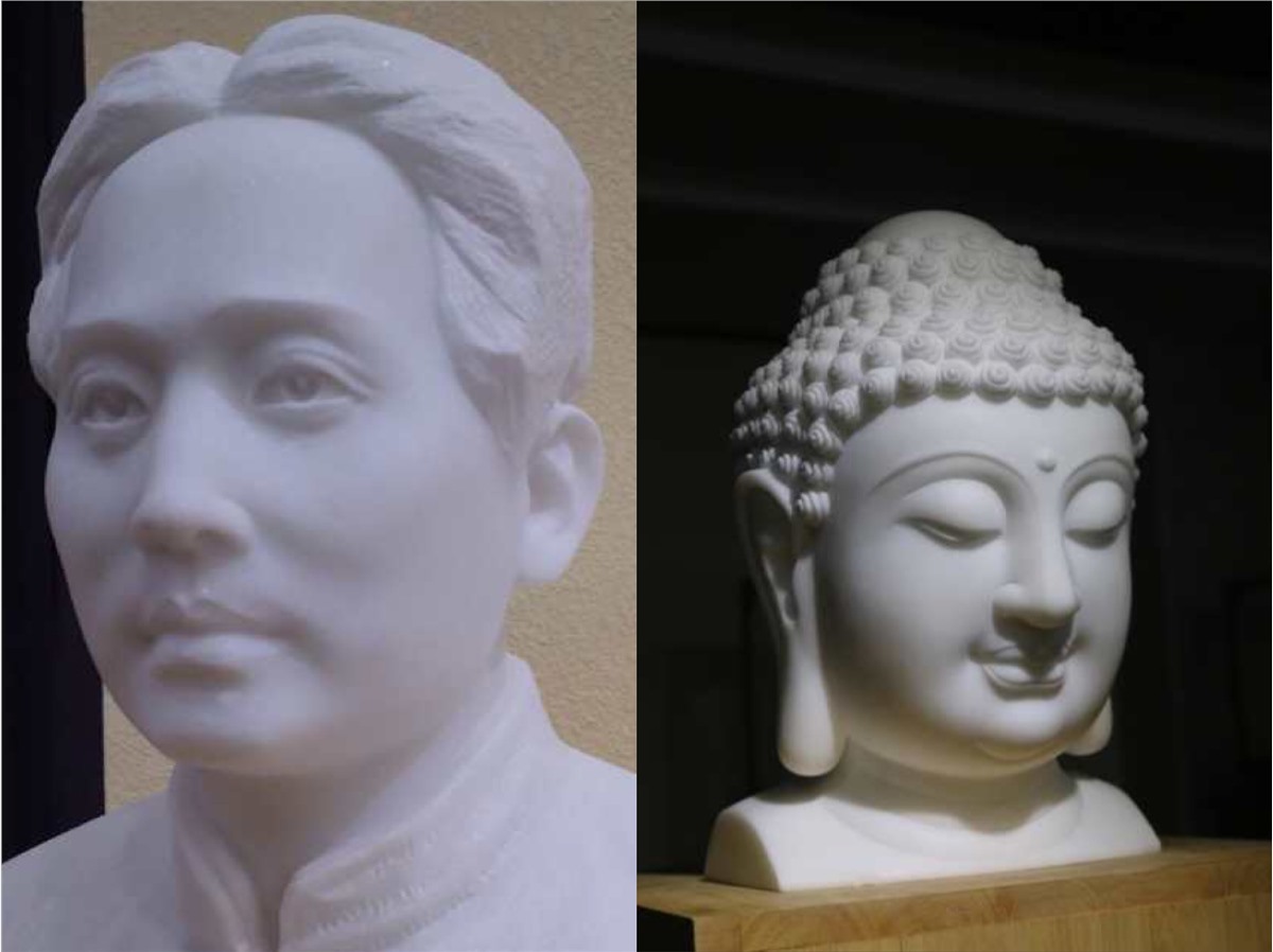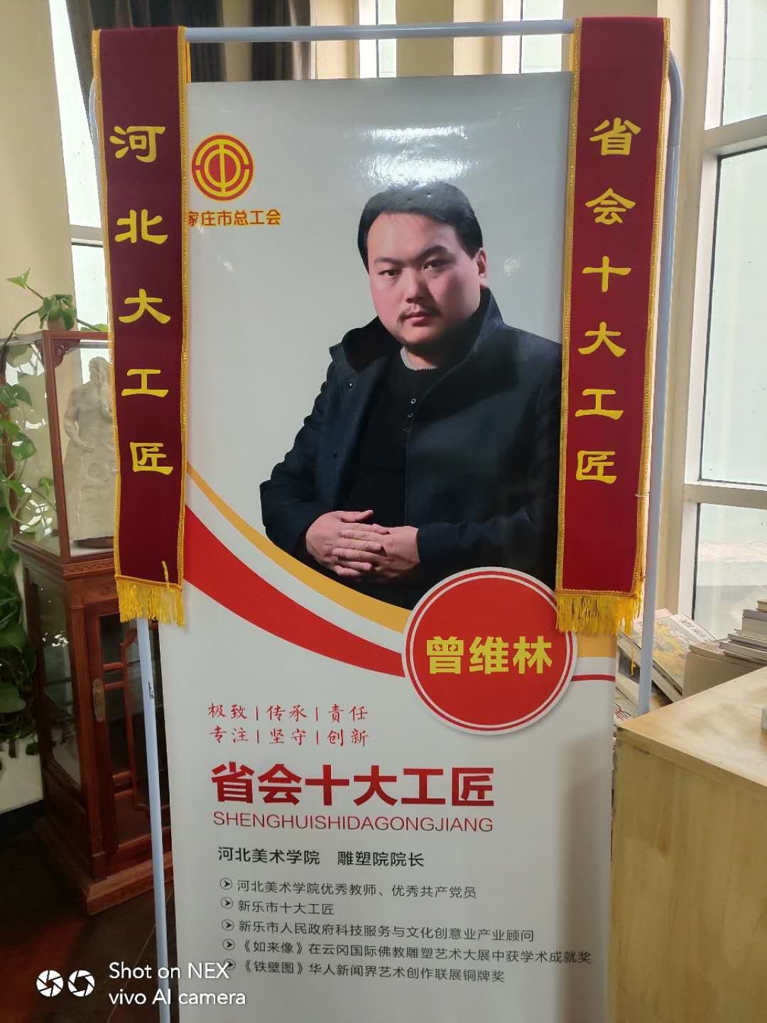 在曾院長(zhǎng)較為簡(jiǎn)陋卻處處布滿精美雕塑作品的辦公室,這位年輕前途無量的曾院長(zhǎng)榮獲“河北十大工匠”的獎(jiǎng)牌和獎(jiǎng)杯映入眼簾。其一身黑色裝束,圓臉長(zhǎng)發(fā)和炯炯有神又顯得正直誠實(shí)的眼睛和舉手投足之間,儼然就是一尊“天生的藝術(shù)大師雕塑”。