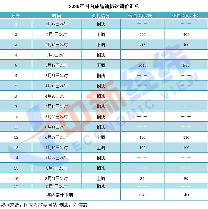 據(jù)中新經緯客戶端統(tǒng)計,2020年以來國內成品油調價已進行了十七輪,具體為上調三次、下調三次,擱淺十一次,汽油總計下調了1545元/噸,柴油總計下調了1490元/噸。其中,3月31日至6月11日的6輪調整均因國際市場原油價格低于40美元/桶而擱淺。如果本輪成品油調價下調,2020年國內成品油調價將呈現(xiàn)“三漲四跌十一擱淺”的格局。