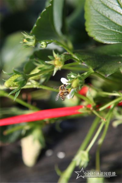 芬芳農(nóng)場(chǎng)占地100余畝,38個(gè)高效暖冬大棚。記者跟隨郭女士進(jìn)入草莓大棚,一種熱浪襲來,室外不足5度,室內(nèi)卻高達(dá)28度。一群群的蜜蜂飛舞著,盡情地吸允著芬芳和甜蜜,輕柔的音樂響起,蜜蜂的舞姿便越加?jì)趁?。顆顆飽滿的草莓紅艷而不妖嬈,但能無盡地滿足味蕾,一口咬下去,漿汁盡出,甜!