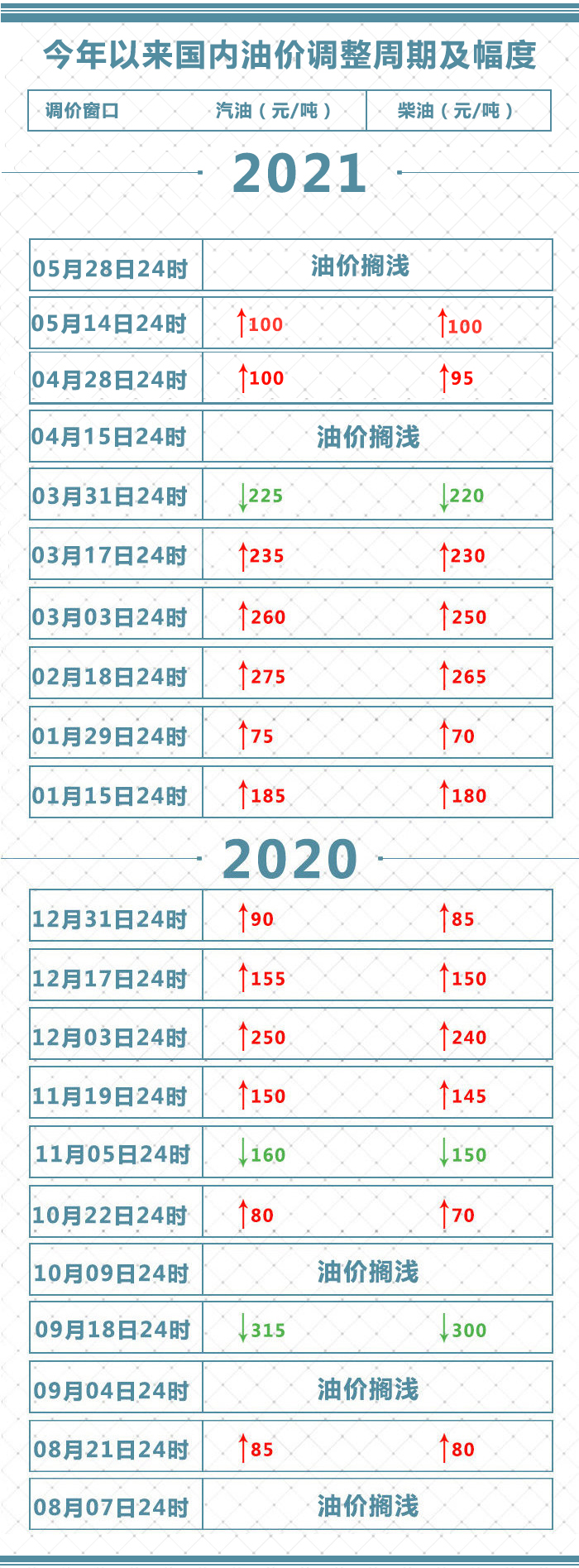 國際原油期貨收盤價格(5月14日—5月27日)市場價格均價比上一個調(diào)價周期漲跌最高最低平均倫敦布倫特原油69.4665.1168.05-0.18%紐約WTI原油66.8562.0565.130.46%美元指數(shù)90.3289.6489.97-0.86%(價格監(jiān)測中心)?年內(nèi)油價變動一覽:七漲一跌兩擱淺?2021年,國內(nèi)成品油調(diào)價已呈現(xiàn)“七漲一跌兩擱淺”的格局。截至本次調(diào)價,汽油價格累計每噸上調(diào)1005元,柴油價格累計每噸上調(diào)970元。?