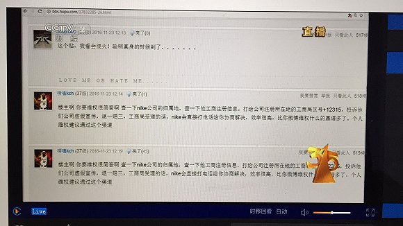 這則消息,最開始是在國內(nèi)著名體育論壇“虎撲”中曝出的,而在昨晚的現(xiàn)場曝光中,央視也大量引用了虎撲網(wǎng)友的發(fā)帖與留言作為曝光的證據(jù),然而,一位不愿透露姓名的爆料人卻告訴封面新聞(thecover.cn)記者,在315的晚會(huì)曝光后,耐克竟然找到虎撲,希望虎撲“刪帖”!