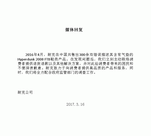 而據(jù)網(wǎng)易財(cái)經(jīng)報(bào)道,耐克公司先后向其發(fā)送了兩份聲明,在第一份聲明中,耐克公司稱,被央視曝光的問題是耐克方面“主動(dòng)發(fā)現(xiàn)的問題”,并將該問題歸納為其官網(wǎng)上對(duì)于該產(chǎn)品(Hyperdunk 2008 FTB)的氣墊描述存在錯(cuò)誤。同時(shí),耐克方面承諾將對(duì)該產(chǎn)品進(jìn)行退貨,但“奇葩”的是,耐克方面還在回應(yīng)中指出:“出于品牌關(guān)懷的考慮,我們還為購買該款產(chǎn)品的消費(fèi)者提供在耐克官網(wǎng)購買單件產(chǎn)品七五折的優(yōu)惠券(電子產(chǎn)品,特別版商品,禮品卡除外)。”