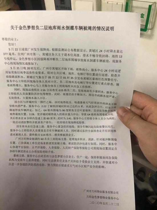 網(wǎng)友@波波沙 是廣州萬(wàn)科金色夢(mèng)想小區(qū)的業(yè)主之一,也是受災(zāi)車主之一。