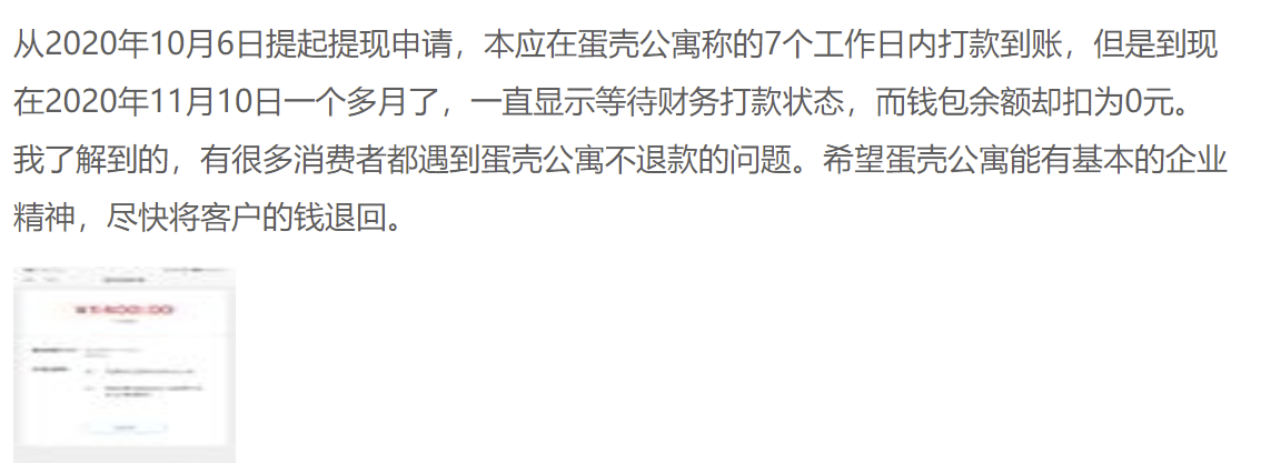 有客戶表示,從2020年10月6日提起提現(xiàn)申請,本應在蛋殼公寓稱的7個工作日內打款到賬,但一個多月過去卻一直顯示等待財務打款狀態(tài)。