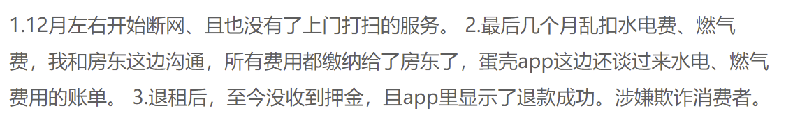 更有租客稱蛋殼公寓在租約的最后幾個月不僅服務偷工減料,水電、燃氣重復繳費,且退租后尚未收到押金,App上卻已經(jīng)顯示退款成功,認為該公司涉嫌欺詐消費者。