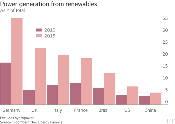 然而,在包括美國和中國在內(nèi)的許多國家,化石能源依然主導(dǎo)著電力供給。中美兩國是去年12月在巴黎達(dá)成的聯(lián)合國(UN)氣候變化協(xié)定最有力的兩大支持者。