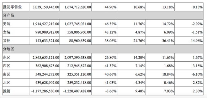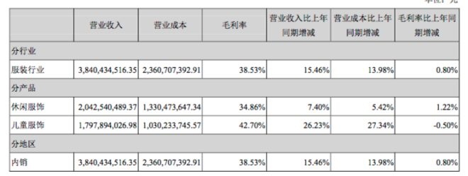 其中主營業(yè)務(wù)收入38.4億元,較上年同期上升15.46%。主要系休閑服飾業(yè)務(wù)及兒童服飾業(yè)務(wù)持續(xù)發(fā)展促進(jìn)了公司銷售收入增長。期內(nèi),兒童服飾業(yè)務(wù)實(shí)現(xiàn)主營收入17.98億元,同比增長26.23%;休閑服飾業(yè)務(wù)實(shí)現(xiàn)主營收入20.41億元,同比增長7.4%。