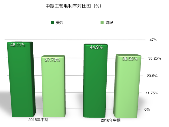 美邦:2016中期44.90%,較2015中期的46.11%下降1.21%。