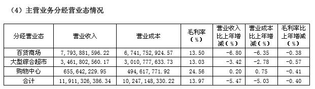 從產(chǎn)品來(lái)看,購(gòu)物中心的毛利率遠(yuǎn)超百貨和超市,達(dá)到24.56%,同比下降0.41%。百貨、超市的毛利率分別為13.50%、13.03%,同比下降分別為0.38%和0.57%。