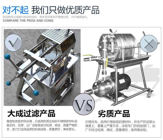 海寧市大成過濾設備有限公司本機工作時為加壓密閉過濾,液料無損耗。液體澄清度好,除菌靈(選用中速濾紙和微孔濾膜除菌效果尤佳)。