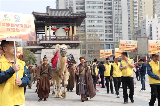 【中國(guó)經(jīng)濟(jì)新聞聯(lián)播訊 記者馮勛明】3月24日,在最熱鬧的西安大唐西市,熙熙攘攘的人群里,駝鈴聲響起,格外悅耳,迎面突然走來(lái)了一群裝扮華麗的駱駝,一隊(duì)唐代模樣的駝工,緊隨其后的是一群身穿民族服裝的美女,有西域姑娘,還有波斯少女,一路載歌載舞。引發(fā)了上千名市民得駐足圍觀,大家紛紛拿出手機(jī),與異域美女合影留念,給駱駝拍照,整個(gè)大唐西市廣場(chǎng)被圍得水泄不通。