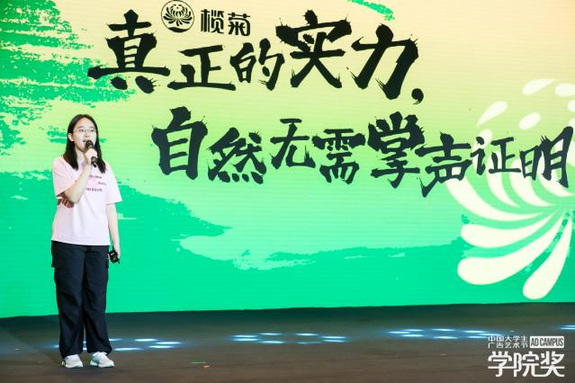 “全場大獎”是創(chuàng)意征集賽事的至高殊榮,備受創(chuàng)意學子的關(guān)注與期待,這不僅是對青年優(yōu)秀作品的一種榮耀加冕,更是企業(yè)和行業(yè)未來創(chuàng)意發(fā)展的風向標。今年,欖菊文案類金獎作品《見證實力無需鼓掌》憑借精妙的創(chuàng)意、豐富的內(nèi)涵成功沖刺總決賽!并由創(chuàng)作學生在青春盛典現(xiàn)場進行精彩提案。