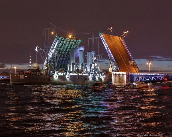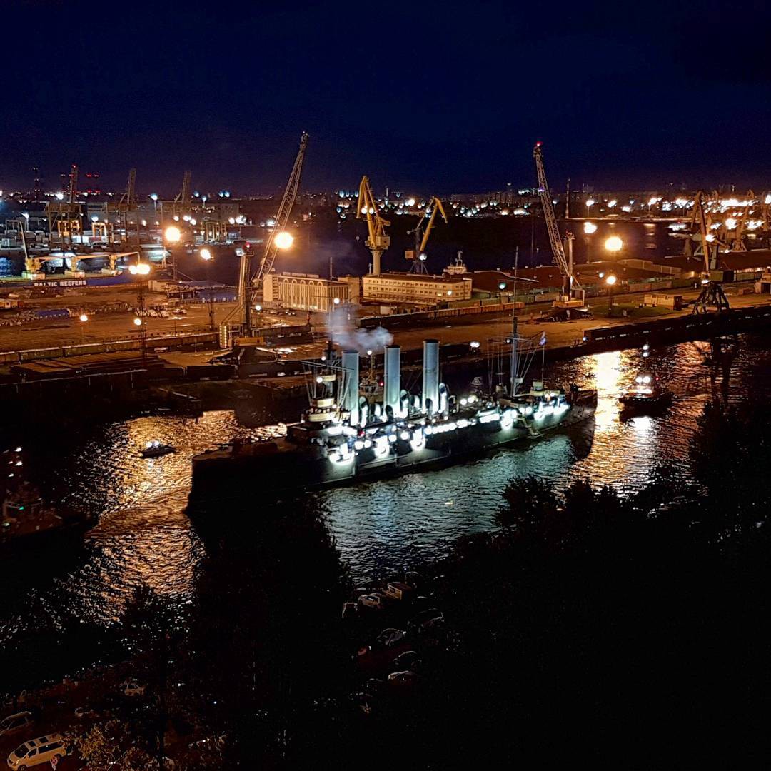 “阿芙樂(lè)爾”號(hào)花了數(shù)小時(shí),從喀瑯施塔得造船廠回到了彼得格勒的岸邊,成千上萬(wàn)的市民和游客在此歡迎她的歸來(lái)。甲板上,船員們一字排開(kāi)進(jìn)行站坡儀式。燈光輝映,“阿芙樂(lè)爾”號(hào)回來(lái)了。