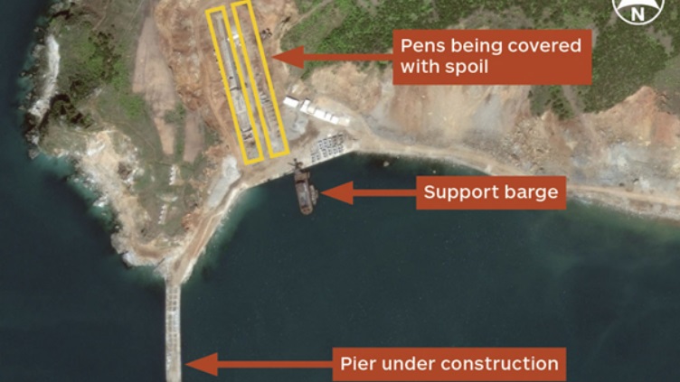 商業(yè)衛(wèi)星圖像顯示,基地的建設(shè)大約是從2009年8月到2012年11月之間開始的,占地約6000平方米的海港已經(jīng)被防波堤圍起。2012年11月的某個(gè)時(shí)間,周圍山上的土石開始被作為建筑材料。