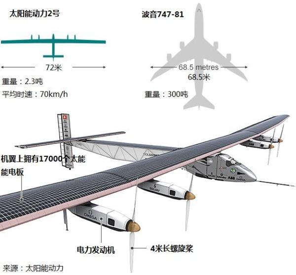 “陽光動力2號”翼展達到72米,比波音747還寬,重量僅2.3噸,相當于一輛家用汽車。