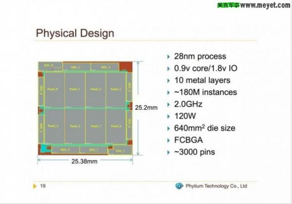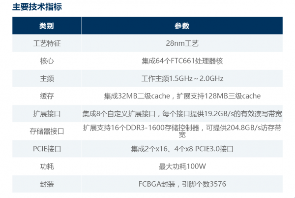 根據(jù)飛騰公司公布的資料,飛騰2000采用ARMv8指令集,集成64個自主設計的FTC661處理器核,主頻為1.5GHz~2.0GHz,制程為28nm,功耗100W。
