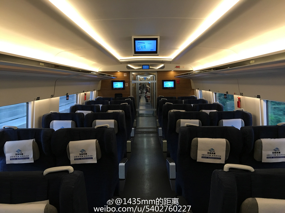 今日清晨大連北站8站臺,由CRH-0207和CRH-0503重聯(lián)擔(dān)當(dāng)?shù)腉8041次列車沿哈大高鐵駛向沈陽站。經(jīng)過前期各項(xiàng)測試合格后,本階段兩輛標(biāo)準(zhǔn)動車組將在實(shí)際載客運(yùn)營的條件下進(jìn)一步積累乘客的實(shí)際乘坐體驗(yàn),為后期量產(chǎn)積累更多經(jīng)驗(yàn)。兩輛動車組均為350km/h速度級別的統(tǒng)型動車組:單列總定員556人,其中商務(wù)座定員10,一等座定員28,二等座定員518;4車設(shè)置無障礙設(shè)施,5車為餐座合造車。兩標(biāo)動座位分布完全一致,車窗設(shè)置合理,車內(nèi)各排均可享受車外風(fēng)光。
