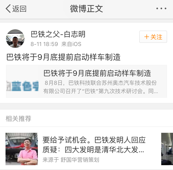 界面新聞?dòng)浾邠艽蛉A贏凱來客服電話詢問能否投資巴鐵基金時(shí),得到回應(yīng)稱,華贏凱來與巴鐵公司是兩家獨(dú)立運(yùn)營(yíng)的公司,“我們這邊兒管不了巴鐵?!迸c此同時(shí),一位投資者卻收到了華贏凱來某客戶經(jīng)理發(fā)來的宣傳文章——《巴鐵將于9月底提前啟動(dòng)樣車制造》,華贏凱來董事長(zhǎng)白丹青名也利用其“巴鐵之父-白志明”的微博賬號(hào)對(duì)該篇文章進(jìn)行了轉(zhuǎn)發(fā)。