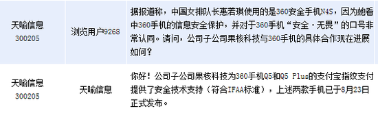 天喻信息回應(yīng),公司子公司果核科技為360手機Q5和Q5 Plus的支付寶指紋支付提供了安全技術(shù)支持(符合IFAA標準),上述兩款手機已于8月23日正式發(fā)布。