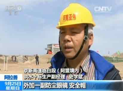 京新高速臨白段阿盟境內(nèi)供水十標(biāo)生產(chǎn)副經(jīng)理,史學(xué)斌:工地上每人一個(gè)防塵脖套,外加衣服防塵眼鏡,安全帽,因?yàn)轱L(fēng)沙太大,在作業(yè)現(xiàn)場(chǎng),眼睛睜不開。