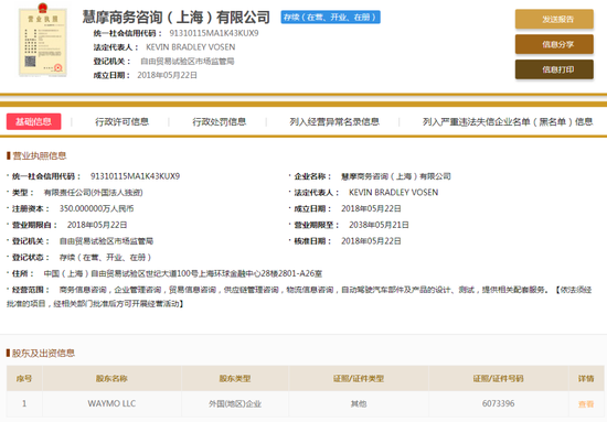 根據(jù)國家企業(yè)信用信息公示系統(tǒng)顯示,一家名為慧摩商務咨詢(上海)有限公司的外國法人獨資公司,5月25日在上海自貿(mào)區(qū)注冊成立。注冊資本350萬元人民幣,谷歌母公司Alphabet旗下的自動駕駛公司W(wǎng)aymo持股100%,公司法人也為Waymo的負責法務的高管。