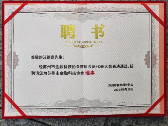 通付盾CEO汪德嘉博士受聘為蘇州市金融科技協(xié)會(huì)理事。