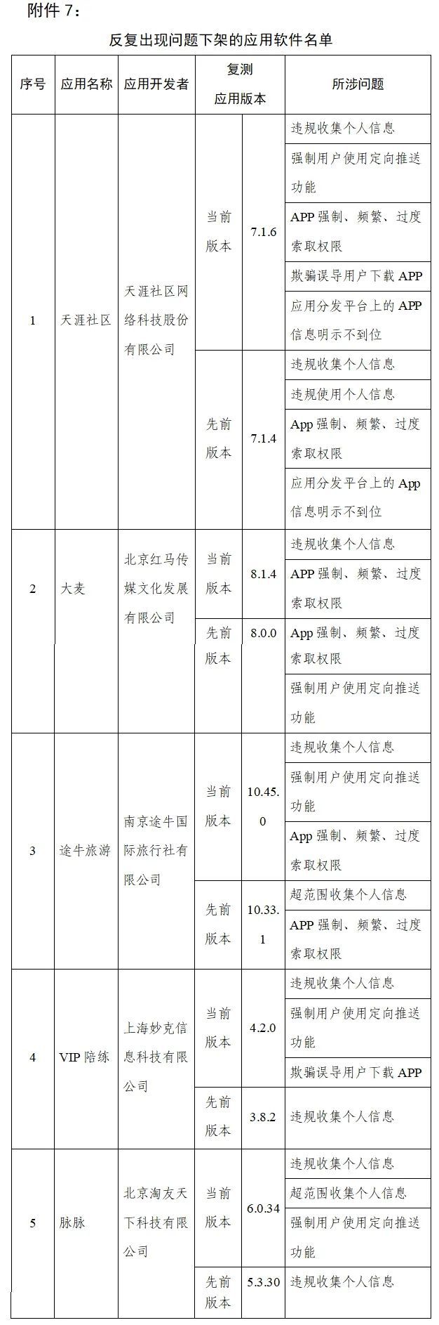 此外,在近期檢測中,工信部發(fā)現(xiàn)天涯社區(qū)、大麥、途牛旅游、VIP陪練、脈脈5家企業(yè)在APP不同版本中反復(fù)出現(xiàn)同類問題,工信部將依法暫停其違規(guī)行為,予以直接下架處理。