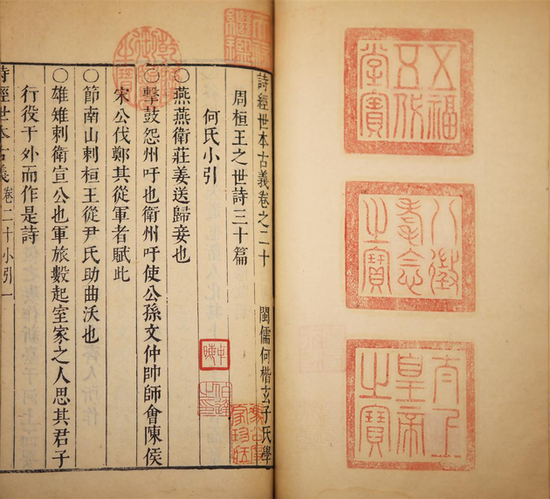 這是明崇禎十四年(1641)刻本,是《詩(shī)經(jīng)世本古義》的初刻之本。原書二函十六冊(cè),其中卷十至十七、二十五至二十八,計(jì)十二卷,三冊(cè),現(xiàn)藏中國(guó)國(guó)家圖書館;卷十八上,一冊(cè),現(xiàn)藏中國(guó)文化遺產(chǎn)研究院(原中國(guó)文物研究所)。國(guó)圖所藏三冊(cè)系1959年自故宮博物院調(diào)撥。文研所所藏一冊(cè),系陳伯達(dá)舊藏。合此三冊(cè),與國(guó)圖、文研所兩家,尚未拼成全帙。