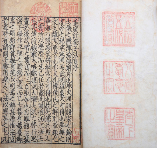 《纂圖互注揚(yáng)子法言》十卷為完整一部,且五璽俱全,文中“征”、“貞”、“桓”、“廓”等字時(shí)缺末筆,蓋避宋諱,但坊刻避諱不嚴(yán)。曾入天祿琳瑯后編,傅增湘1917年曾在寶瑞臣處見(jiàn)過(guò)此書,《藏園群書經(jīng)經(jīng)眼錄》中有記錄,之后銷聲匿跡。據(jù)悉,天祿琳瑯續(xù)編著錄的宋版《纂圖互注揚(yáng)子法言》一共三部,第一部、第三部分存國(guó)家圖書館和臺(tái)北故宮博物院,此為第二部,而今將近百年再度現(xiàn)身。