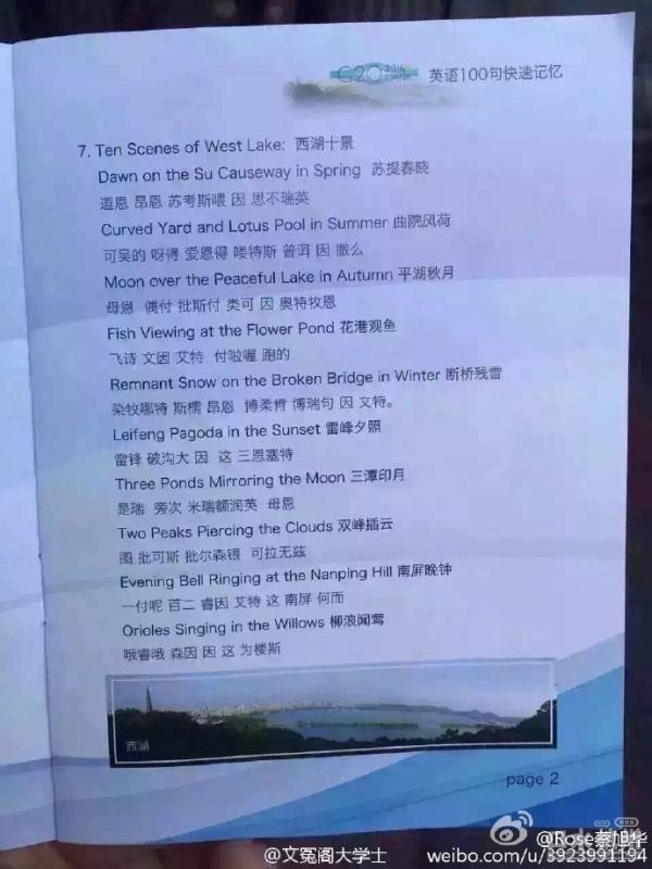 這份《英語100句快速記憶》小冊子中不少中文字注音令人一頭霧水。如“杭州,某斯特,不優(yōu)特服四體,因掐那”實際上是“Hangzhou,the most beautiful city in China”(杭州,中國最美麗的城市)的注音?!巴馑固乩卓?,白斯特愛去愛可順恩因杭州”看似天書,實際上是說“West Lake, the best attraction in Hangzhou”(杭州最美在西湖)。類似的注音還包括“杭州,啊派愛那達斯俺俄思”,即“Hangzhou,a paradise on earth”(人間天堂——杭州)。