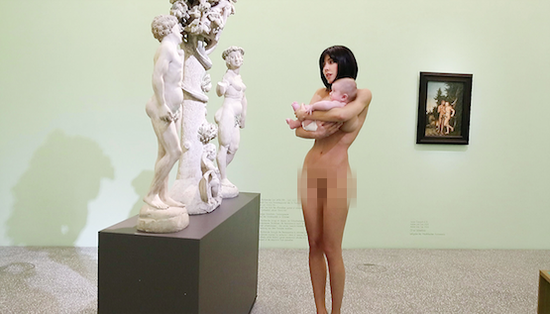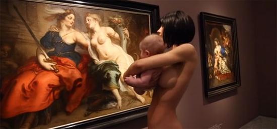 ▼ 赤裸著在博物館里,抱著一個(gè)嬰兒;