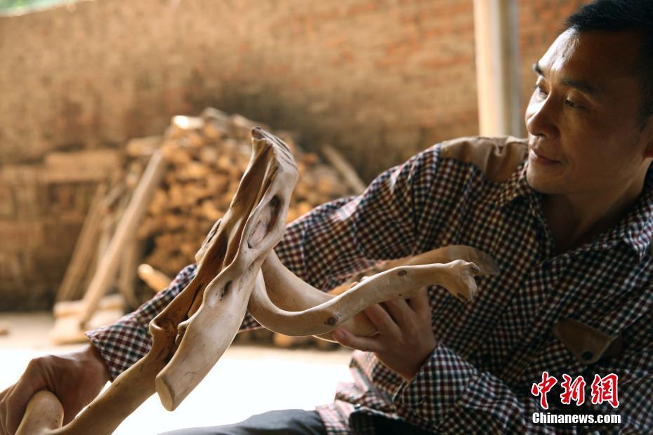 貴州赤水是中國“十大竹鄉(xiāng)”之首。全市現(xiàn)有竹林面積131萬畝,其中楠竹51萬畝,雜竹80萬畝,年產(chǎn)商品楠竹600萬根。如何開發(fā)寶貴的竹資源是赤水人繁榮經(jīng)濟(jì)和開發(fā)特色旅游商品的大事。圖為四十四歲的殘疾人晏伯倫,已經(jīng)干木刻十多年了,成了赤水遠(yuǎn)近聞名的民間藝人。中新社發(fā) 丁偉 攝