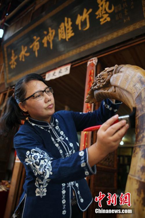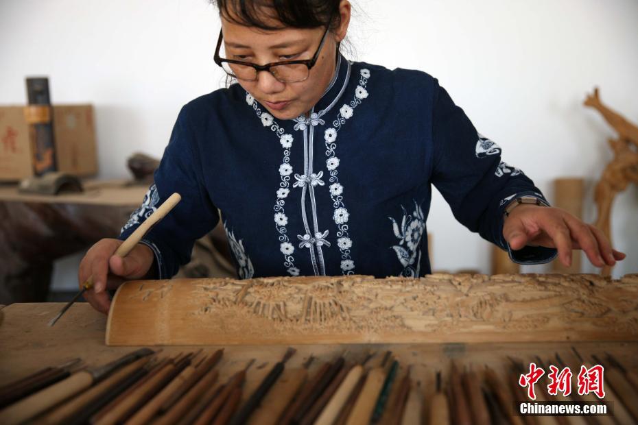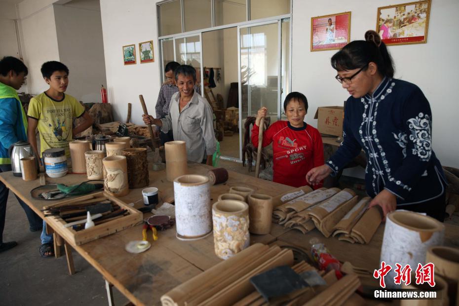 貴州赤水是中國“十大竹鄉(xiāng)”之首。全市現(xiàn)有竹林面積131萬畝,其中楠竹51萬畝,雜竹80萬畝,年產(chǎn)商品楠竹600萬根。如何開發(fā)寶貴的竹資源是赤水人繁榮經(jīng)濟(jì)和開發(fā)特色旅游商品的大事。赤水市政協(xié)委員、傳統(tǒng)工藝美術(shù)大師盧華英是竹品手工藝的帶頭人,她不僅不斷開發(fā)以竹子為原料的手工藝品,而且免費(fèi)傳授雕刻技藝并帶領(lǐng)殘疾人脫貧致富。圖為盧華英帶領(lǐng)殘疾人一塊學(xué)習(xí)竹品雕刻。中新社發(fā) 丁偉 攝