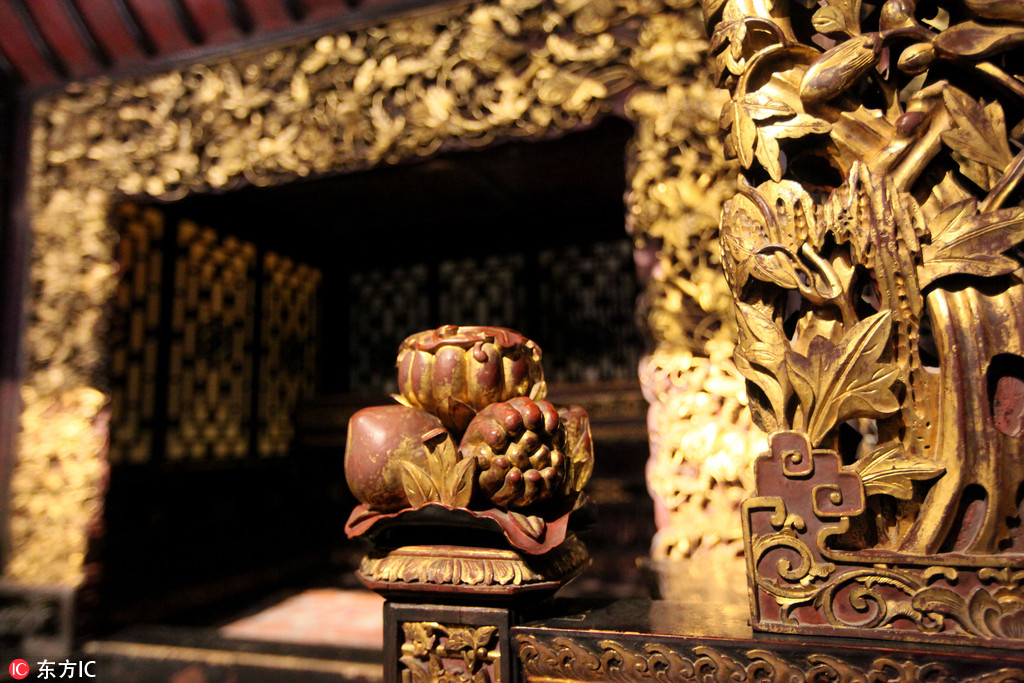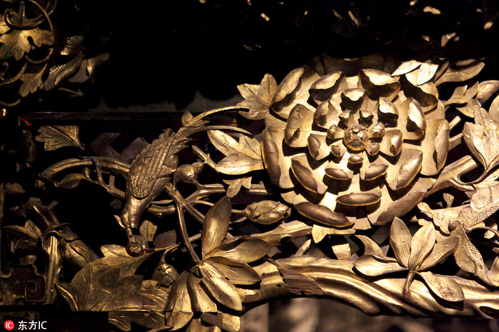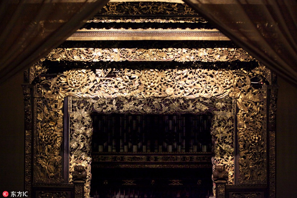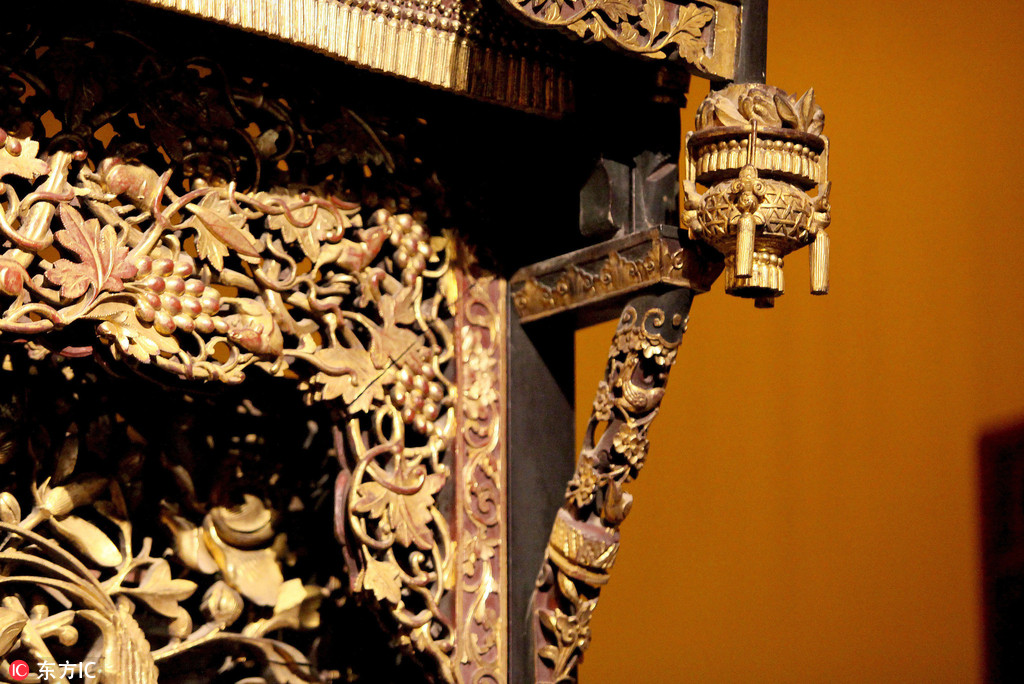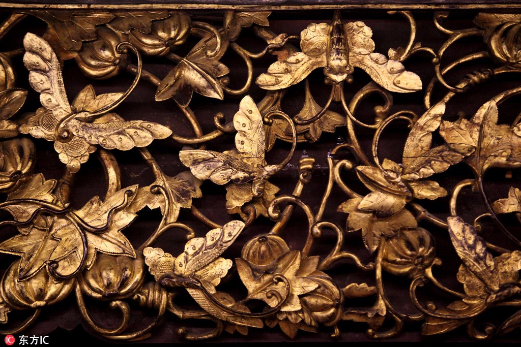 2016年11月17日,重慶渝北,巴渝古床博物館現(xiàn)“天下第一床”,此床名叫六柱五檐滿金雕花大床,系巴渝古床博物館的鎮(zhèn)館之寶。床高2.9米,寬2.8米,這張大床“渾身”上下金碧輝煌,由內(nèi)向外看,共有五層,每層檐板上雕刻著梅、蘭、竹、菊的圖紋,其中穿插著蝙蝠、蝴蝶、牡丹、壽桃、石榴等多種寓意吉祥的圖案。