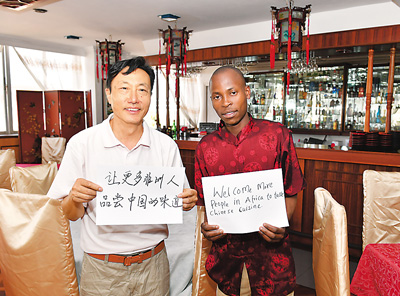 2月8日,在肯尼亞首都內(nèi)羅畢一家中國餐廳,餐廳經(jīng)營者祁溥瑩(左)和同事帕特里克·奧根切·奧托托展示各自的新年心愿。新華社記者 孫瑞博攝
