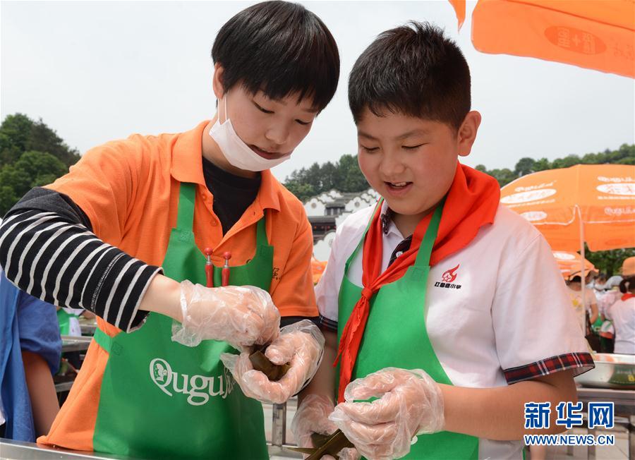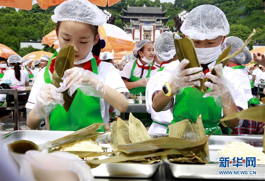 5月10日,來自湖北宜昌的小學生在湖北省秭歸縣屈原故里景區(qū)學包粽子。