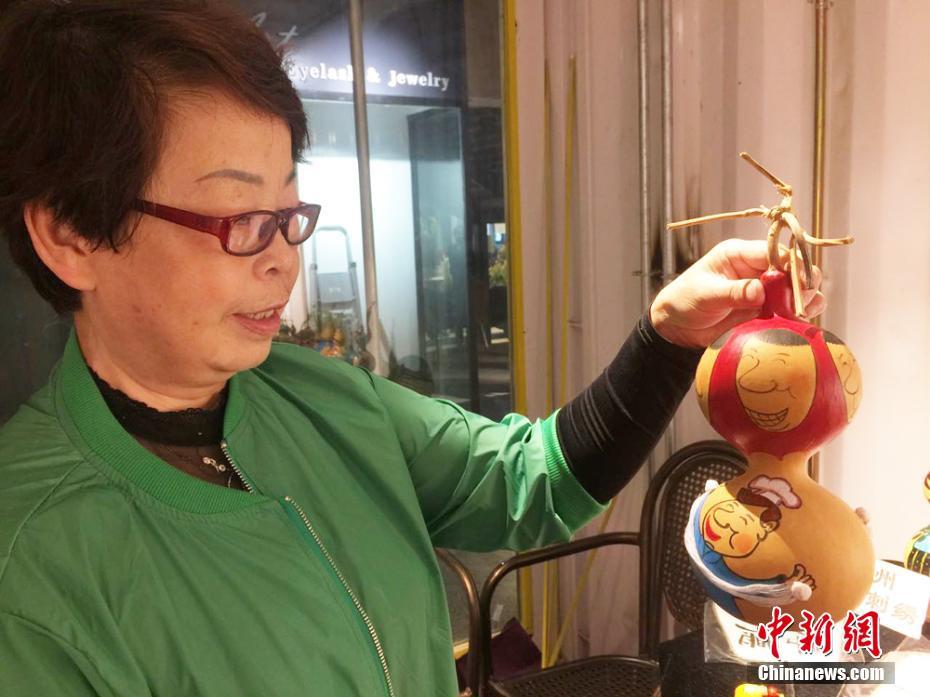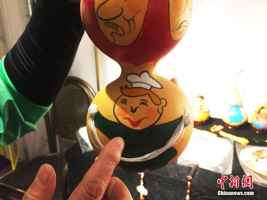 近日,在蘭州文化創(chuàng)意產(chǎn)業(yè)園內(nèi),蘭州藝人丁永蓮展出自己的創(chuàng)意葫蘆,供市民參觀。她將葫蘆雕刻與漫畫二者結(jié)合起來進(jìn)行創(chuàng)作,作品涉及人物漫畫、環(huán)保宣傳、寓言故事等,形象生動,趣味十足。徐雪 攝